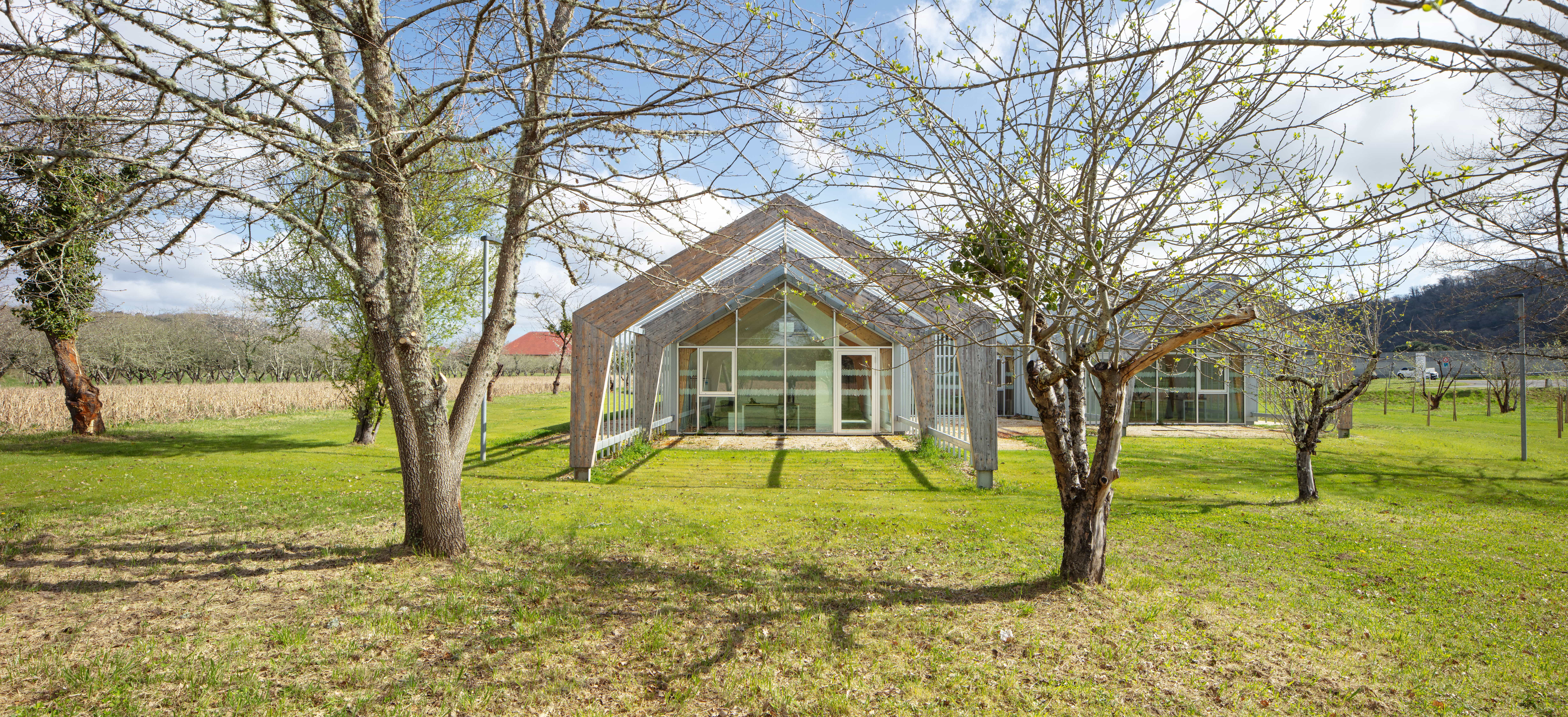 Travail de signalétique pour l’espace administratif du SPIP de Mauzac-et-Grand-Castang (24). Placée  à côté du centre pénitentier, cette nouvelle construction doit faire partie de l’institution, mais aussi s’en démarquer en offrant une image moins fermée. CoCo Architecture a conçu la volumétrie du nouveau bâtiment en utilisant le vocabulaire architectural des bâtiments agricoles tels que la serre ou le hangar. Le projet s’implante dans le verger existant en suivant sa trame orthogonale et en préservant le patrimoine arboricole du lieu. Cette trame est intégrée à l’intérieur du bâtiment avec la création de patios plantés. Grâce à ces patios, toutes les circulations bénéficient de lumière naturelle. Les lanières du projet se prolongent en treilles et portiques bois pour accueillir des plantations de kiwis grimpants.
