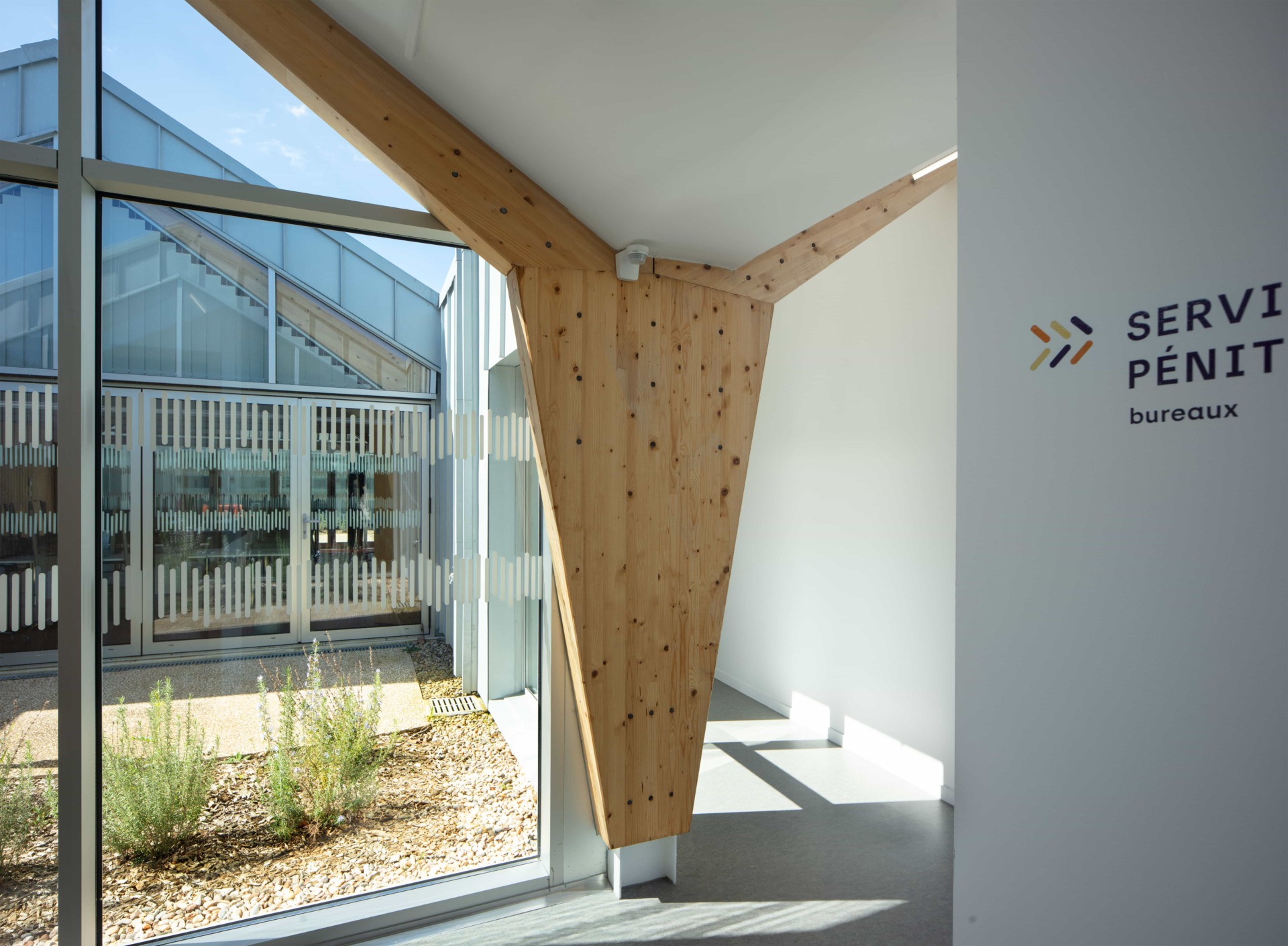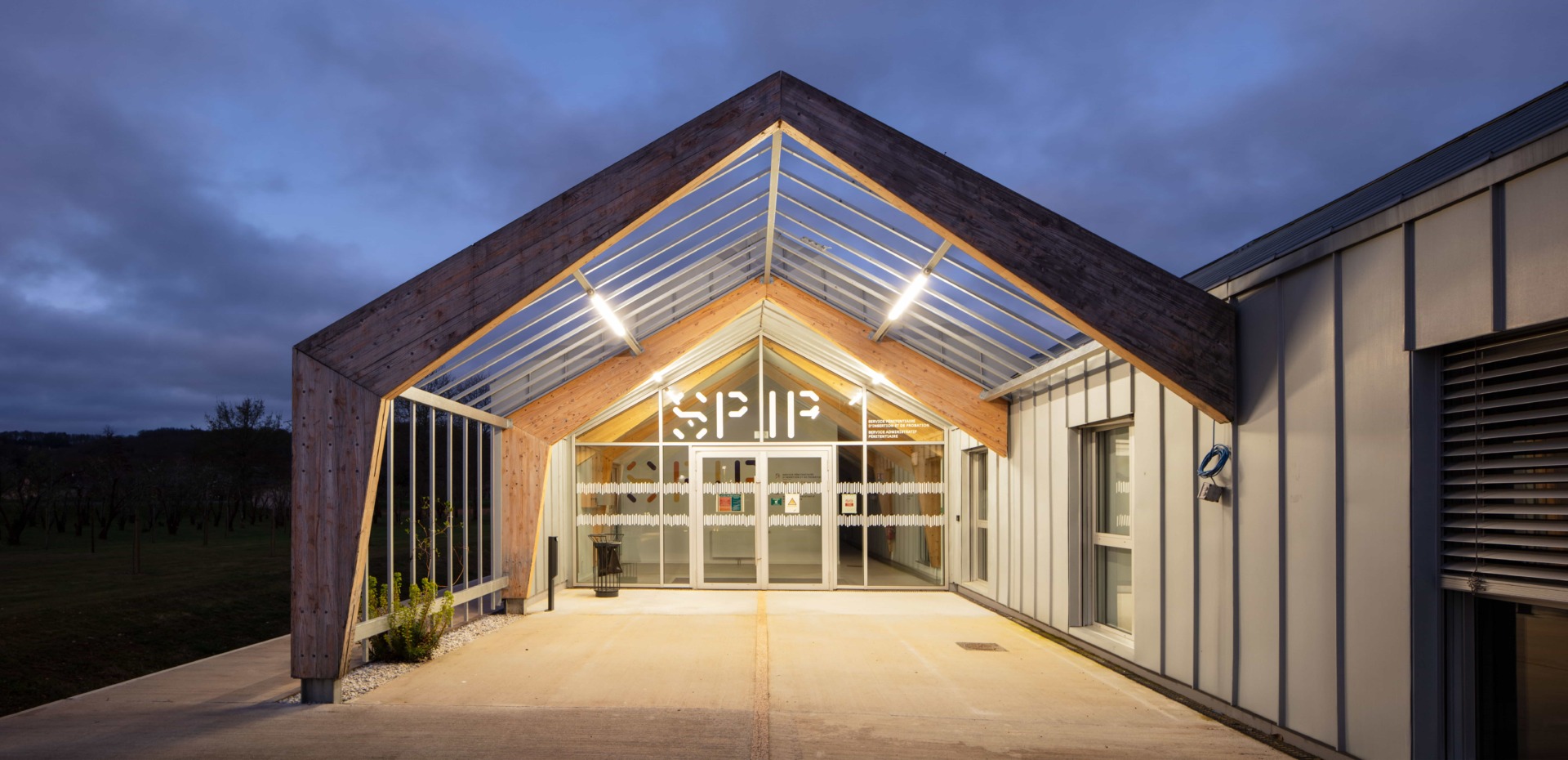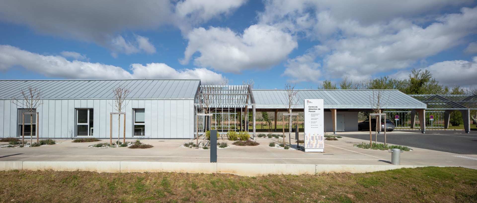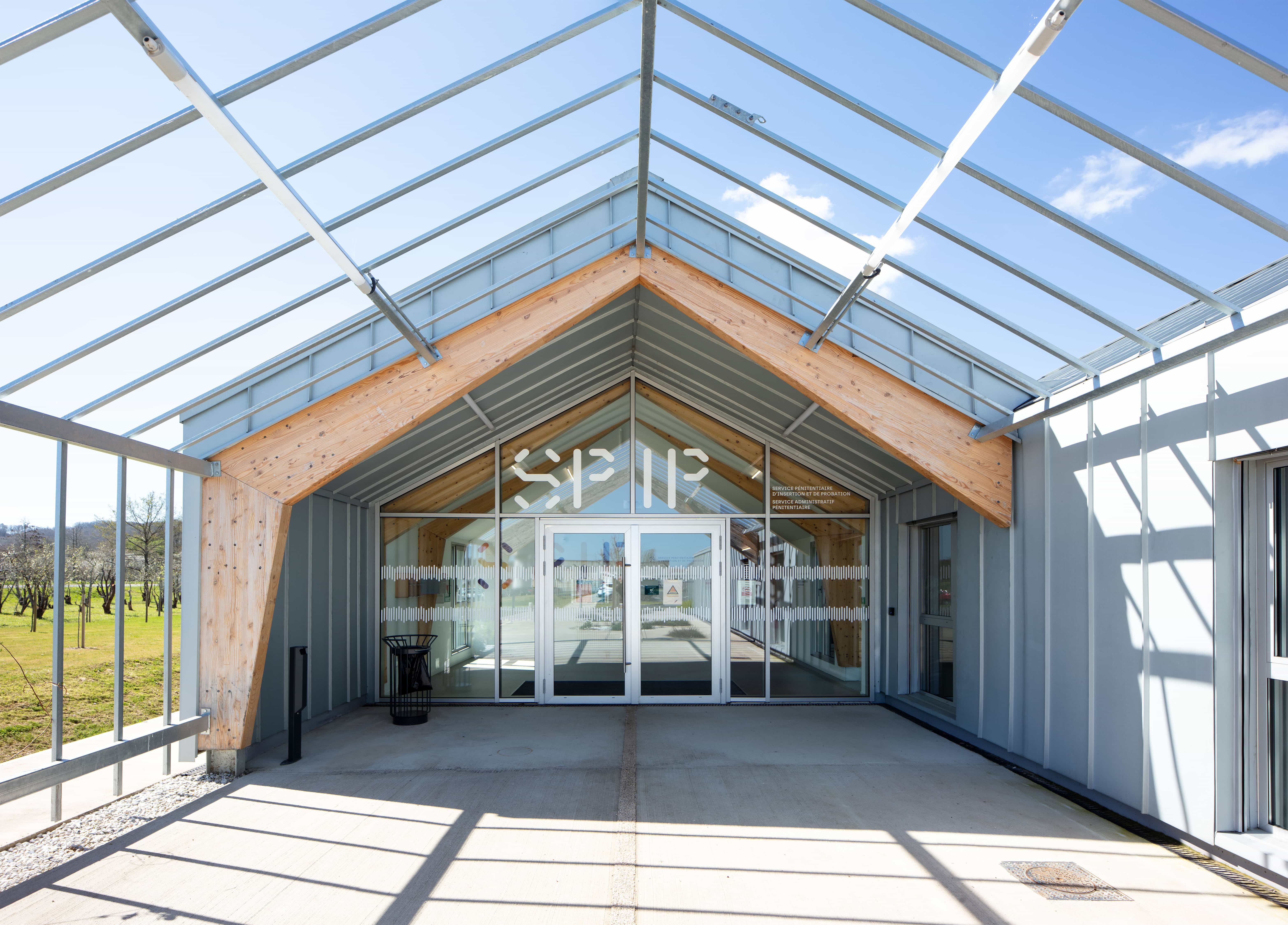 Travail de signalétique pour l’espace administratif du SPIP de Mauzac-et-Grand-Castang (24). Placée  à côté du centre pénitentier, cette nouvelle construction doit faire partie de l’institution, mais aussi s’en démarquer en offrant une image moins fermée. CoCo Architecture a conçu la volumétrie du nouveau bâtiment en utilisant le vocabulaire architectural des bâtiments agricoles tels que la serre ou le hangar. Le projet s’implante dans le verger existant en suivant sa trame orthogonale et en préservant le patrimoine arboricole du lieu. Cette trame est intégrée à l’intérieur du bâtiment avec la création de patios plantés. Grâce à ces patios, toutes les circulations bénéficient de lumière naturelle. Les lanières du projet se prolongent en treilles et portiques bois pour accueillir des plantations de kiwis grimpants.