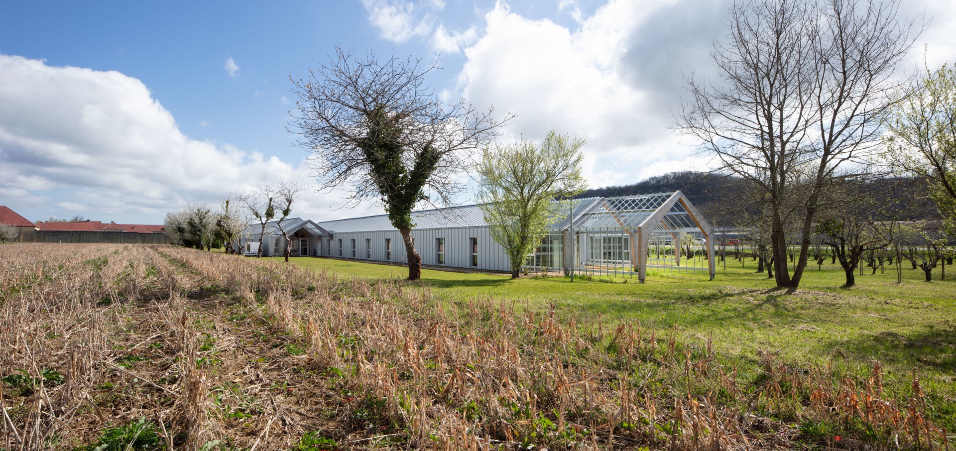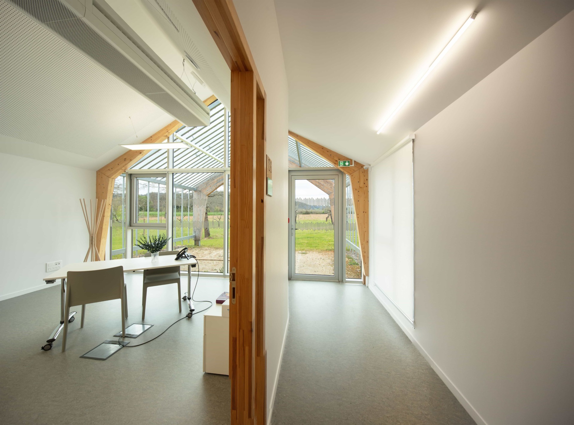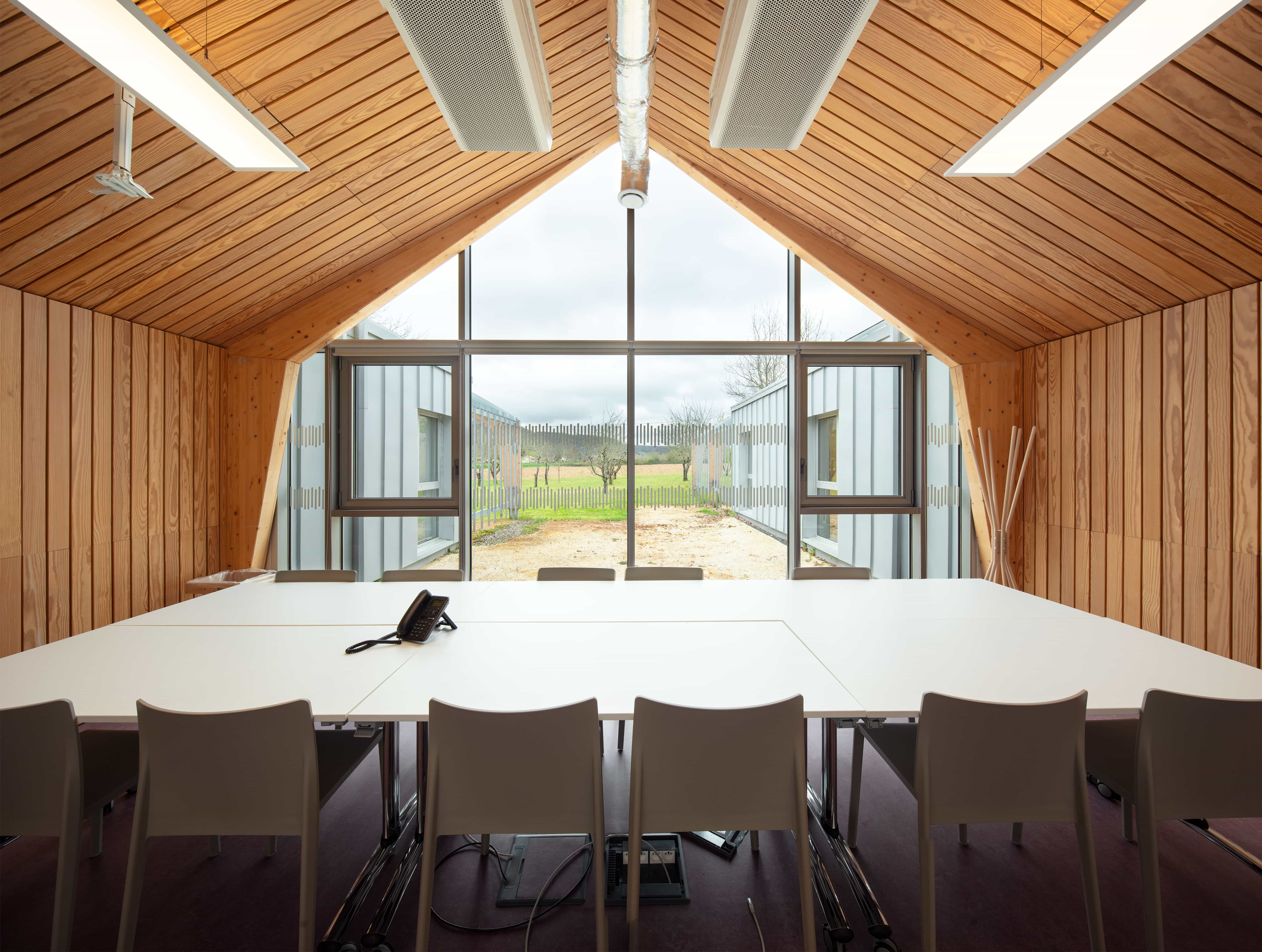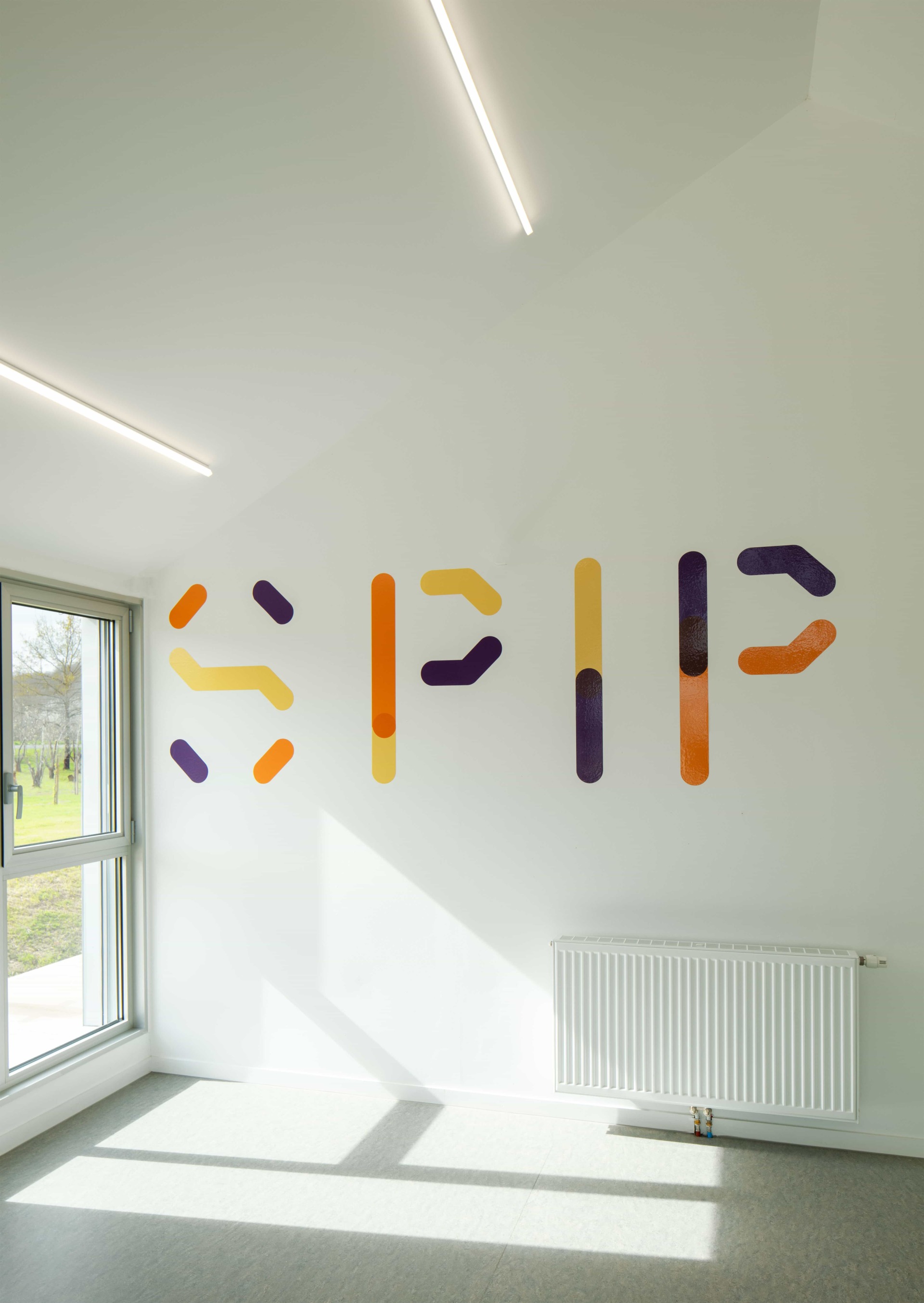 Travail de signalétique pour l’espace administratif du SPIP de Mauzac-et-Grand-Castang (24). Placée  à côté du centre pénitentier, cette nouvelle construction doit faire partie de l’institution, mais aussi s’en démarquer en offrant une image moins fermée. CoCo Architecture a conçu la volumétrie du nouveau bâtiment en utilisant le vocabulaire architectural des bâtiments agricoles tels que la serre ou le hangar. Le projet s’implante dans le verger existant en suivant sa trame orthogonale et en préservant le patrimoine arboricole du lieu. Cette trame est intégrée à l’intérieur du bâtiment avec la création de patios plantés. Grâce à ces patios, toutes les circulations bénéficient de lumière naturelle. Les lanières du projet se prolongent en treilles et portiques bois pour accueillir des plantations de kiwis grimpants.